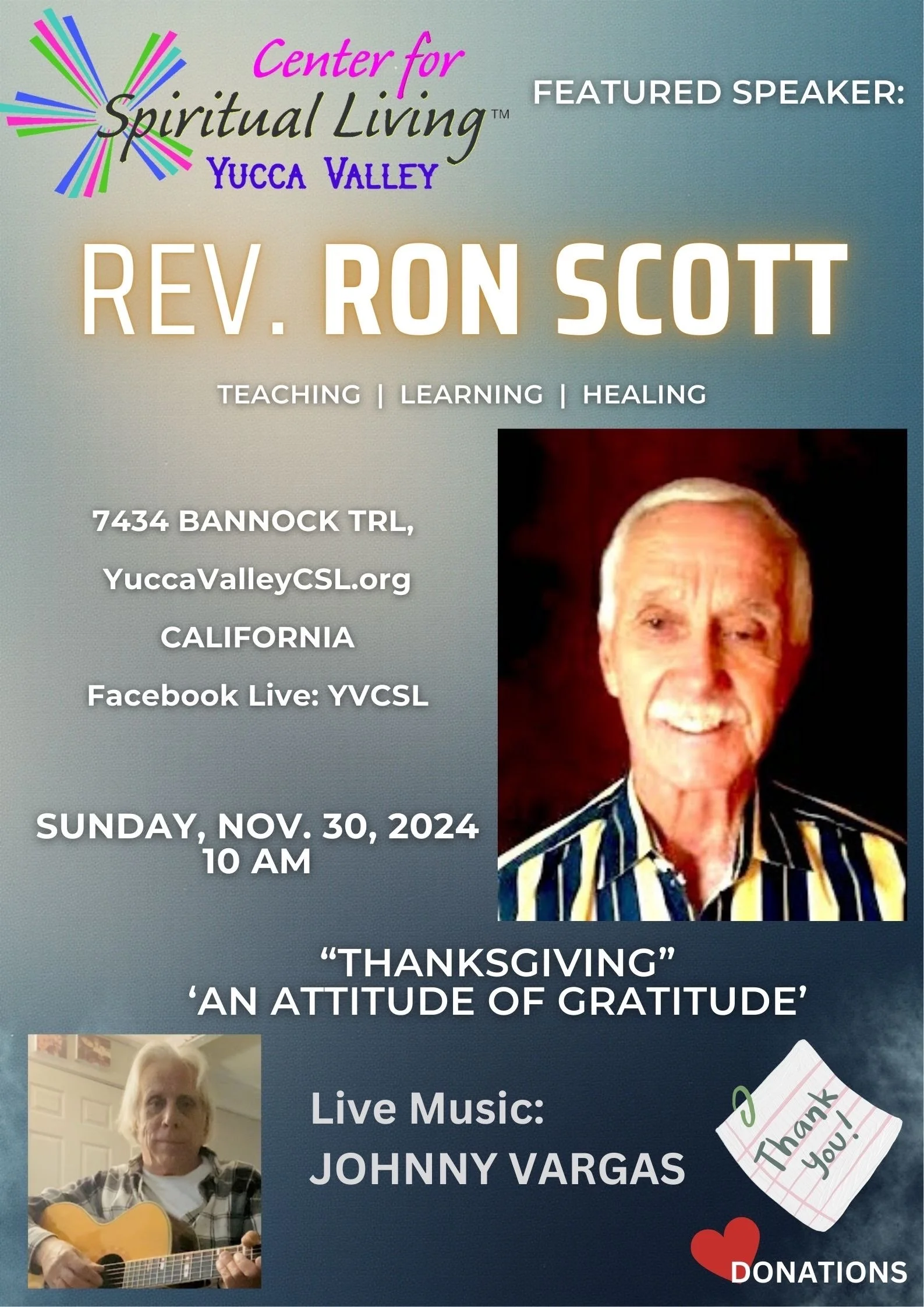 At YVCSL, each Sunday Celebration features a new inspirational speaker and talented musician. We love the variety of experience and expansion of understanding this brings!